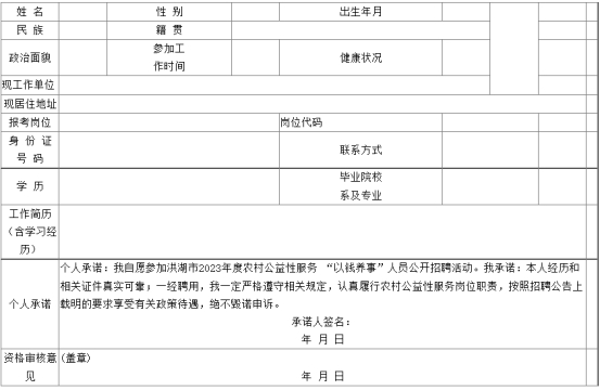 附件2洪湖市2023年度面向社會(huì)公開(kāi)招聘農(nóng)村公益性服務(wù)“以錢養(yǎng)事”人員報(bào)名登記表