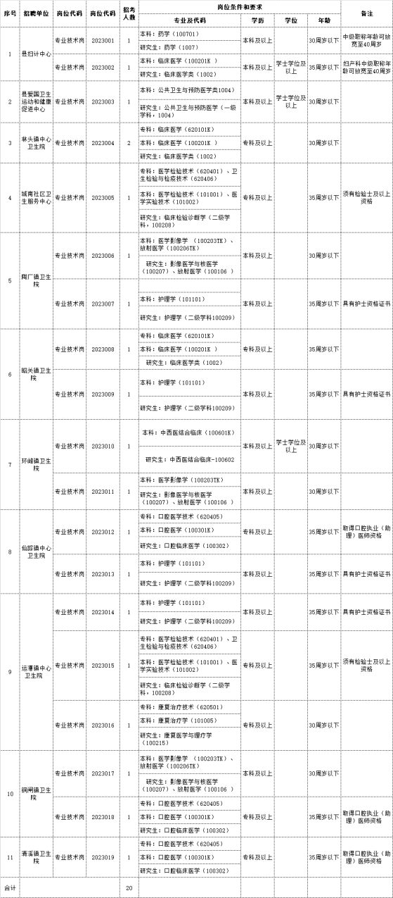 2023年含山縣醫(yī)療衛(wèi)生事業(yè)單位公開(kāi)招聘工作人員20名,各招聘崗位(計(jì)劃)及報(bào)考條件見(jiàn)《2023年含山縣醫(yī)療衛(wèi)生事業(yè)單位公開(kāi)招聘工作人員崗位計(jì)劃表》(附件)。招聘公告統(tǒng)一在含山縣人民政府網(wǎng)(www.ahhs.gov.cn)、含山縣衛(wèi)生健康委員會(huì)信息公開(kāi)網(wǎng)(含山縣政府信息公開(kāi)網(wǎng)—政府部門(mén)信息公開(kāi)—含山縣衛(wèi)生健康委員會(huì))發(fā)布。