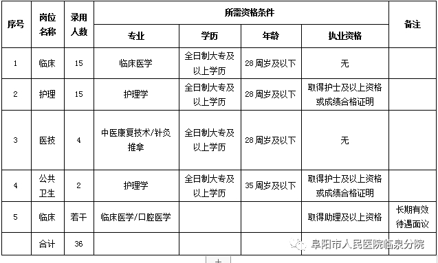 (三)阜陽市人民醫(yī)院臨泉分院(宋集中心衛(wèi)生院)有權(quán)根據(jù)崗位需求變化及報名情況等因素,調(diào)整、取消或終止個別崗位的招聘工作,并對本次招聘享有最終解釋權(quán)。