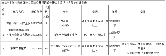 具體招聘崗位和條件見(jiàn)《2023年度淮南市市屬公立醫(yī)院公開(kāi)招聘碩士研究生及以上人員崗位計(jì)劃表》(附件1)