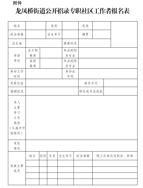 附件:龍鳳橋街道公開招錄專職社區(qū)工作者報(bào)名表