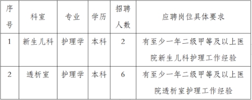 根據(jù)醫(yī)院發(fā)展需要,我院現(xiàn)面向社會公開招聘護理專業(yè)工作人員8名。現(xiàn)將有關事項公告如下: