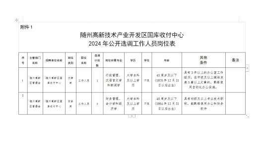 附件1、隨州高新技術(shù)產(chǎn)業(yè)開發(fā)區(qū)國庫收付中心2024年公開選調(diào)工作人員崗位表