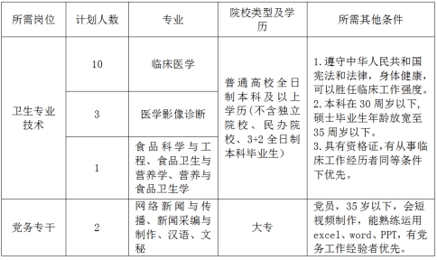 1.具有招聘崗位所需的學歷、專業(yè)知識和業(yè)務能力。學歷要求全日制本科及以上學歷(不含獨立院校、民辦院校、3+2全日制本科畢業(yè)生),所學專業(yè)須與招聘專業(yè)對口,具有資格證或臨床工作經(jīng)歷者同等條件下優(yōu)先。2.本科年齡原則在30周歲以下(1994年1月1日以后出生),碩士畢業(yè)生年齡放寬至35周歲以下。