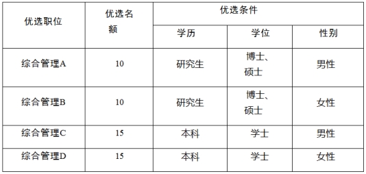 優(yōu)選職位分為四類(lèi),其中綜合管理A、綜合管理B兩類(lèi)職位面向全國(guó)普通高校2024屆全日制博士研究生、碩士研究生,以及全球排名前200名高校畢業(yè)的博士、碩士;綜合管理C、綜合管理D兩類(lèi)職位面向第二輪“雙一流”建設(shè)高校2024屆全日制本科生,以及全球排名前200名高校畢業(yè)的本科生。根據(jù)教研廳函〔2019〕1號(hào)文件規(guī)定,自2017年起,由國(guó)家統(tǒng)一下達(dá)招生計(jì)劃、考試招生執(zhí)行相同政策和標(biāo)準(zhǔn)的非全日制研究生可報(bào)考符合條件的相應(yīng)崗位。