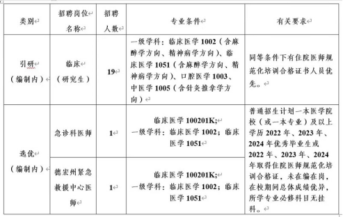 2.急診科、緊急救援中心醫(yī)師崗位:普通招生計劃一本醫(yī)學(xué)院校(或一本專業(yè))及以上學(xué)歷2022年、2023年、2024年優(yōu)秀畢業(yè)生或2022年、2023年、2024年取得住院醫(yī)師規(guī)范化培訓(xùn)合格證,未在編在崗,在校期間總體成績優(yōu)異,所學(xué)專業(yè)必修科目無掛科。