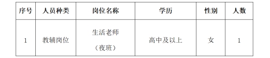 因?qū)W校實(shí)際用人需求,現(xiàn)招聘生活老師1名(女、夜班)。
