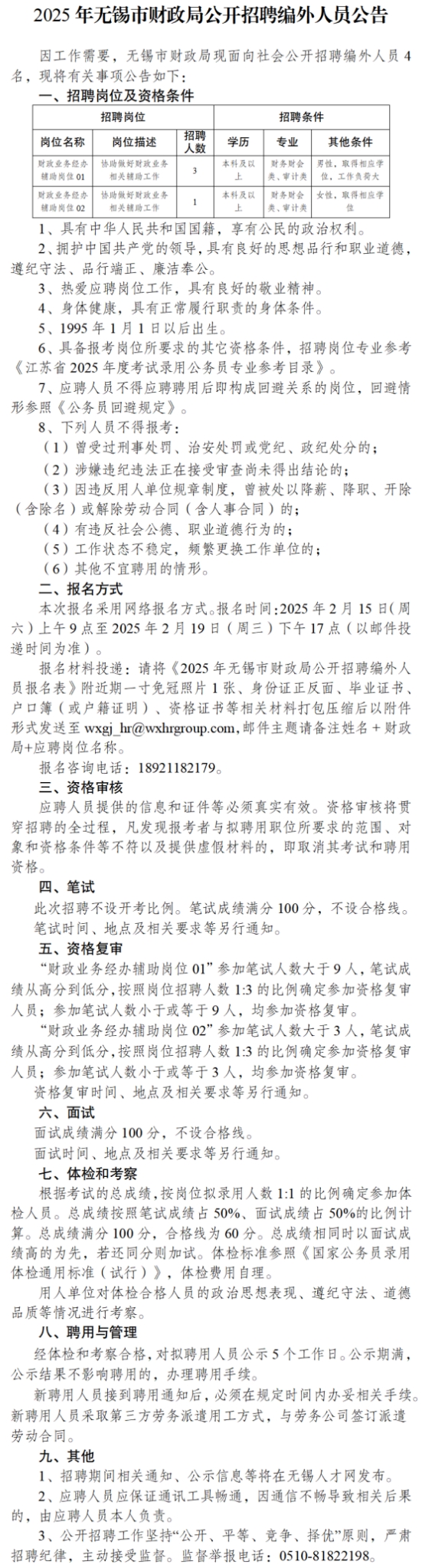 2025年無錫市財(cái)政局公開招聘編外人員公告